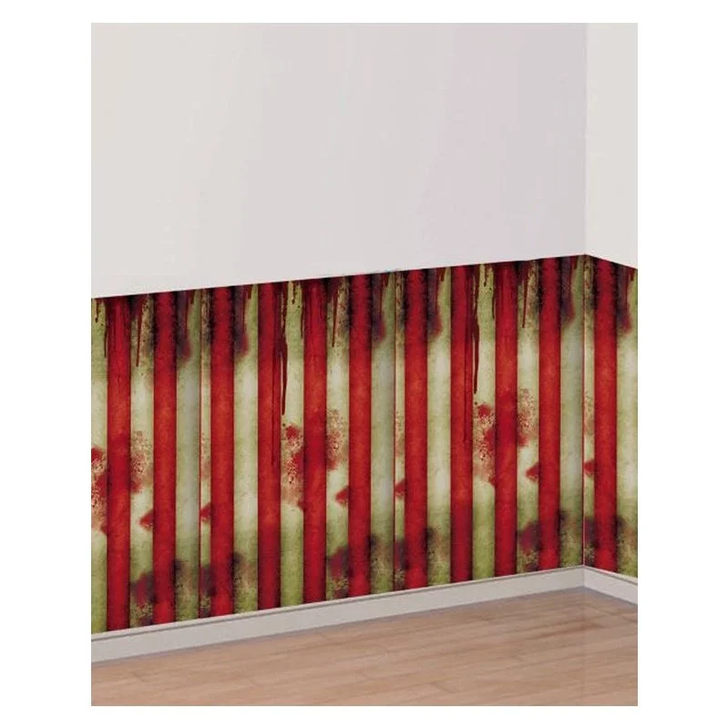 Turn your house into a sinister circus with this Creepy Carnival Room Roll. The blood-smeared red and white stripes can be hung along walls or any other flat surface with blue tack or double-sided tape. The room roll is plastic and measures 1.2m x 12m / 4ft x 40ft. Suitable for indoor or outdoor use.