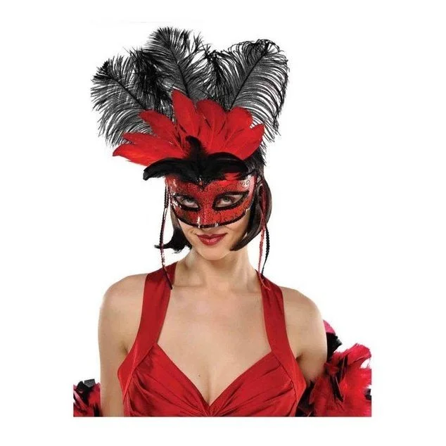 This deep crimson Temptation Eye Mask is the perfect way to catch their eye. Featuring a ruby red mask with an intricate jet black trim and a crown of scarlet and black feathers, this accessory creates an alluring and captivating look. A fantastic choice for a fancy dress party, Halloween or any occasion where you would like to unmask your glamour! So get yours and Masquerade with us today!