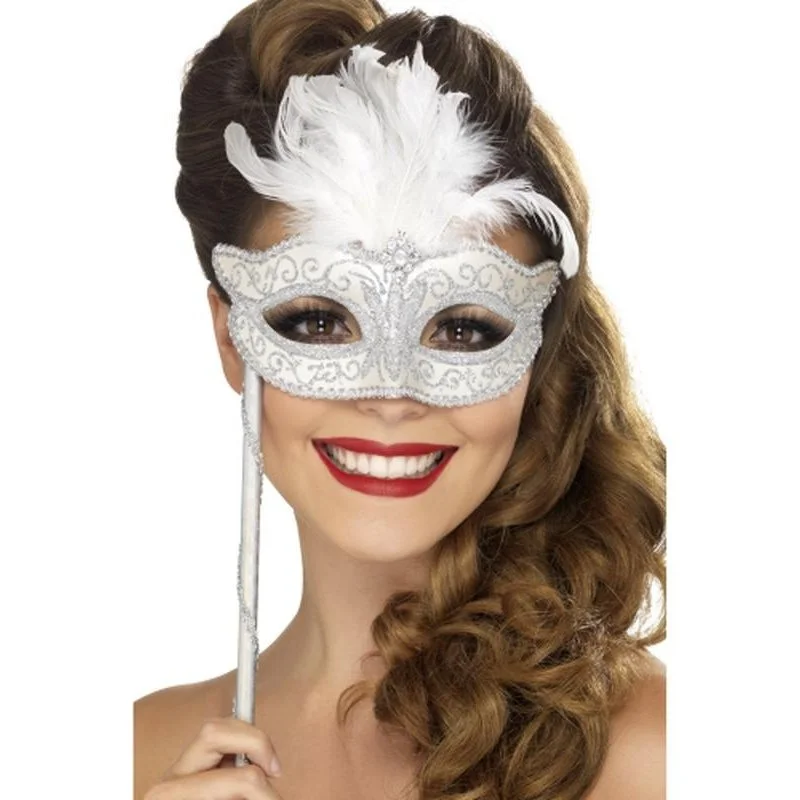 Baroque Fantasy Eyemask, Silver, with Feathers and Handle