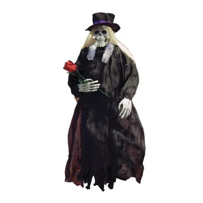 Creepy 36 inch tall hanging skeleton with black tattered shroud, black top hat with purple strip, and he is carrying a red rose.