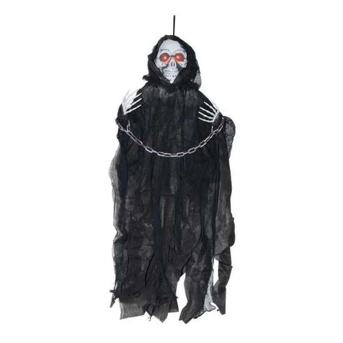 Skull and skeleton hands draped in black robe with chain attached to wrists.