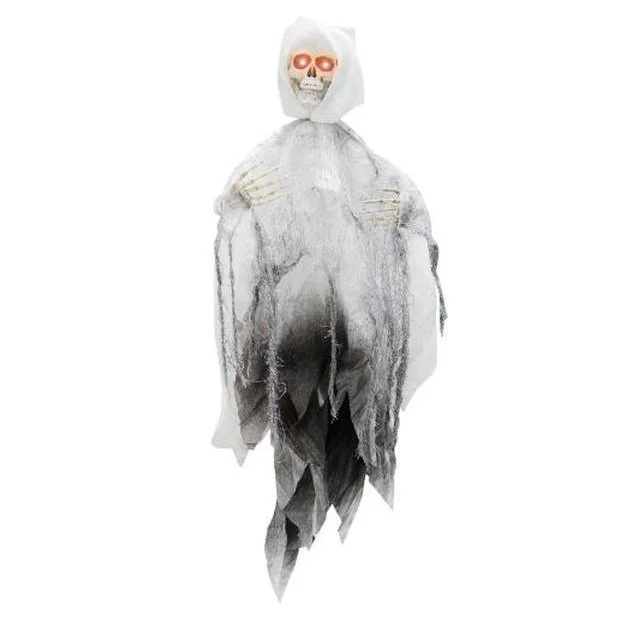 White gauzy reaper hangs from any corner in your haunted scene. The eyes light up red and it also shakes in fear as will all your guests! Drapey gauze drifts spookily with every breeze!