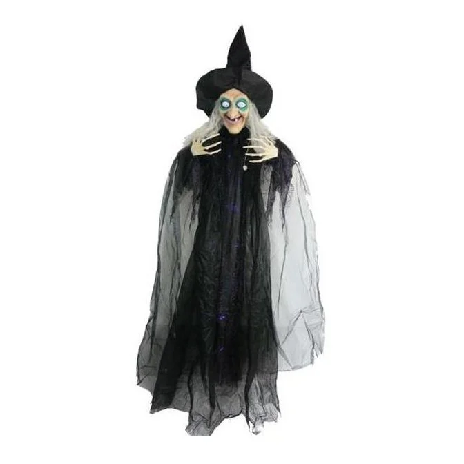 Add extra spook to your home décor with this scary animated hanging witch decoration. This frightening spellcaster is poised to hex you. This Animated Hanging Witch has a long nose with posable arms, long black gauzy gown with purple accents, long gray hair and witch hat.