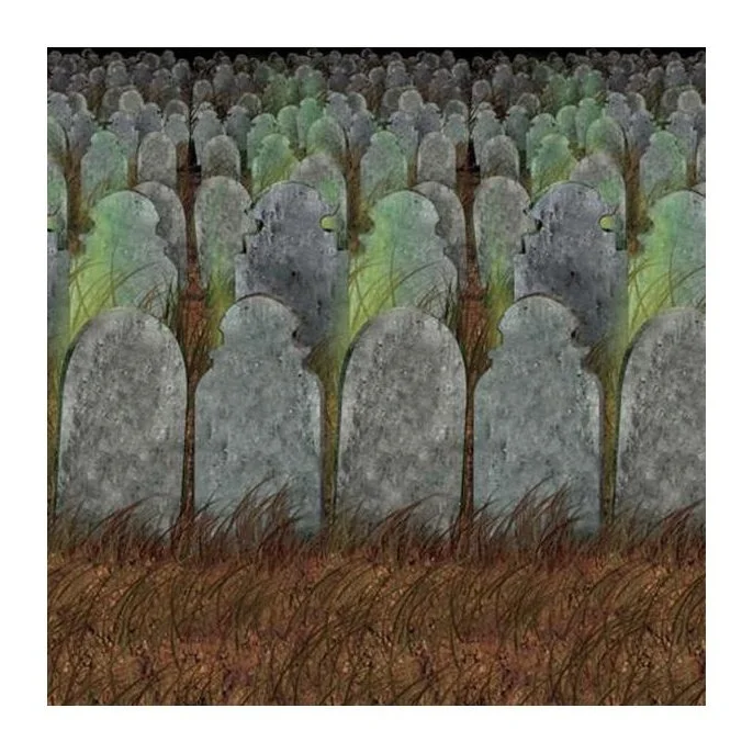 This graveyard backdrop is great for photo-ops, decoration or even as a backdrop for your spooky Halloween party event. Very striking grave yard scene with tombstones. Made with PEVA. 4ft x 30ft. Attach to walls as desired.