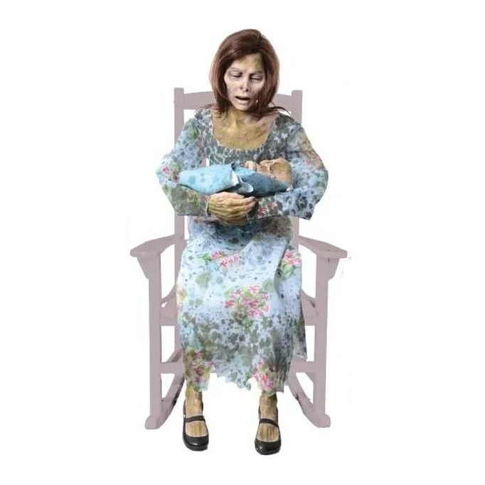 Mouldy Mommy is a hauntingly creepy life-size character that portrays the tragic tale of a mother and child locked in their last embrace for all eternity. This forgotten family rocks back and forth in any chair and has horrifyingly realistic slush-PVC head and hands that look as though they are rotting and covered with mould and fungus, a fabric-wrapped slush-PVC baby, blow-molded plastic feet, tattered mouldy dress and shawl and an easy-to-assemble metal frame.