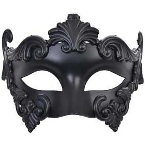 This matte black Masquerade Mask could be used for either a male or female. With the mix of 3D swirls, the look created has a strong Roman and Venetian style. The mask is lightweight plastic but has some good substance for a strong look. Black ribbons are attached at the sides to tie the mask to the head. Such a great mask for a Masquerade Ball.